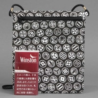• ■小紋手ぬぐい「家紋」で仕立てたサンプル商品です。大きさの参考としてロングサイズのタバコを置いて撮影しています。
